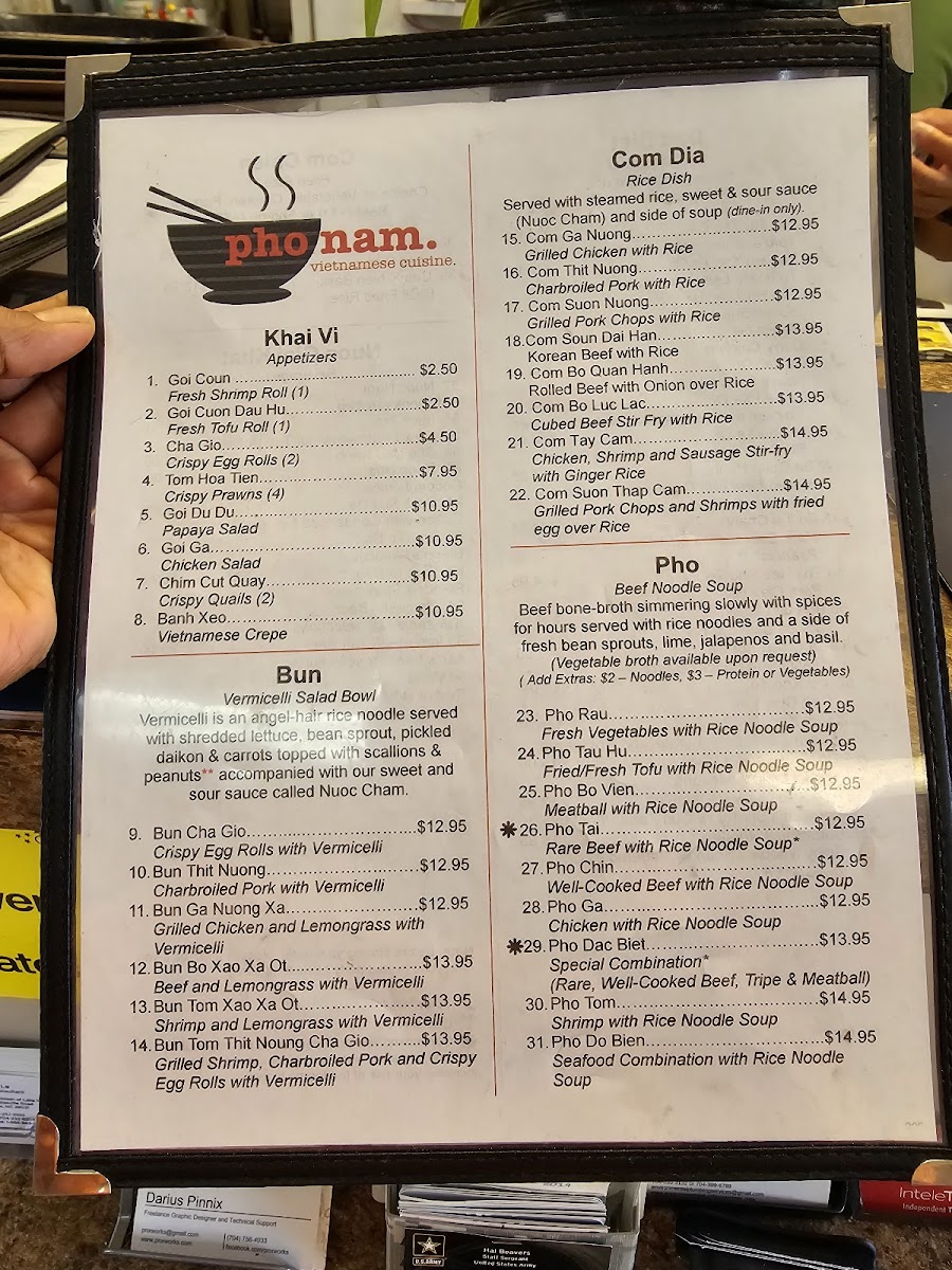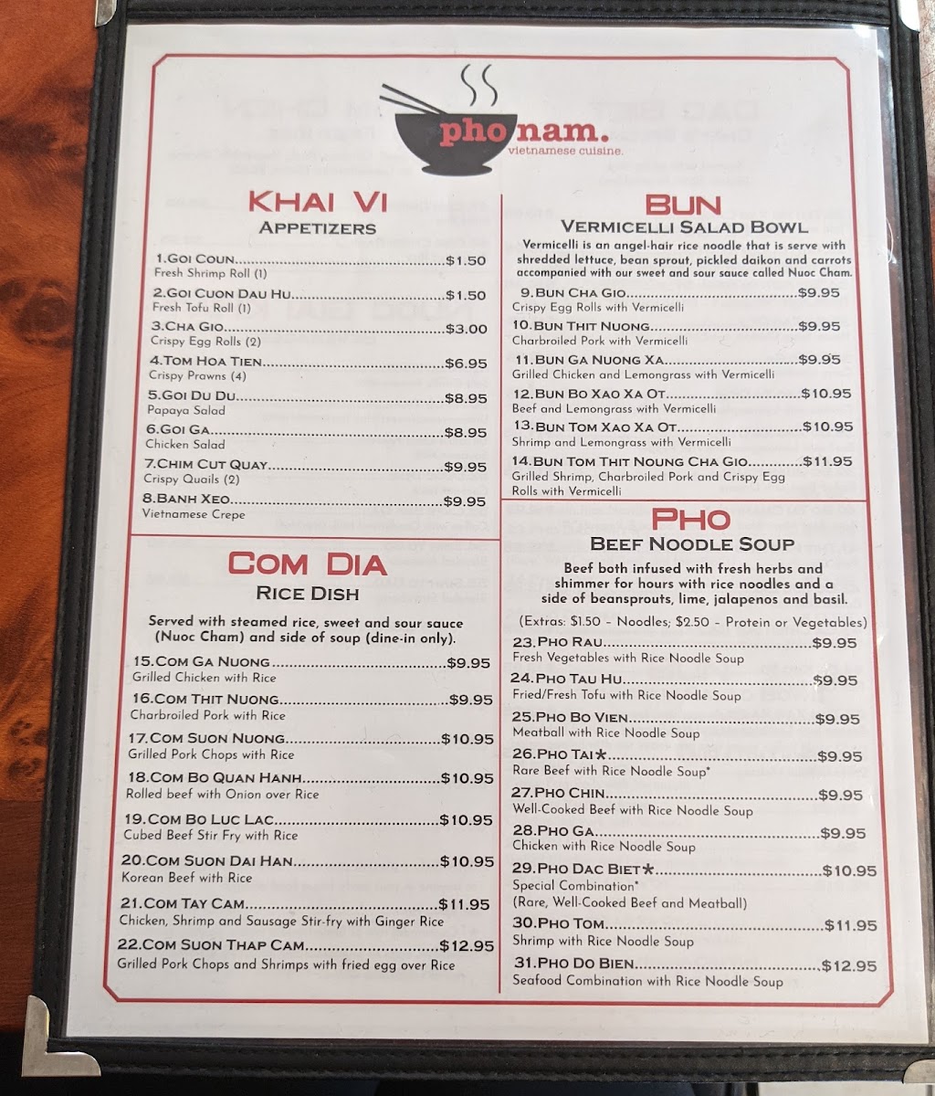 Overall, Pho Nam Vietnamese offers a well-rounded menu filled with traditional Vietnamese flavors, from fresh appetizers to rich pho and vibrant rice dishes, along with delicious beverages to complete your experience. Whether you're a fan of grilled meats, fresh rolls, or comforting soups, there's something for everyone at this cozy spot in Cornelius.